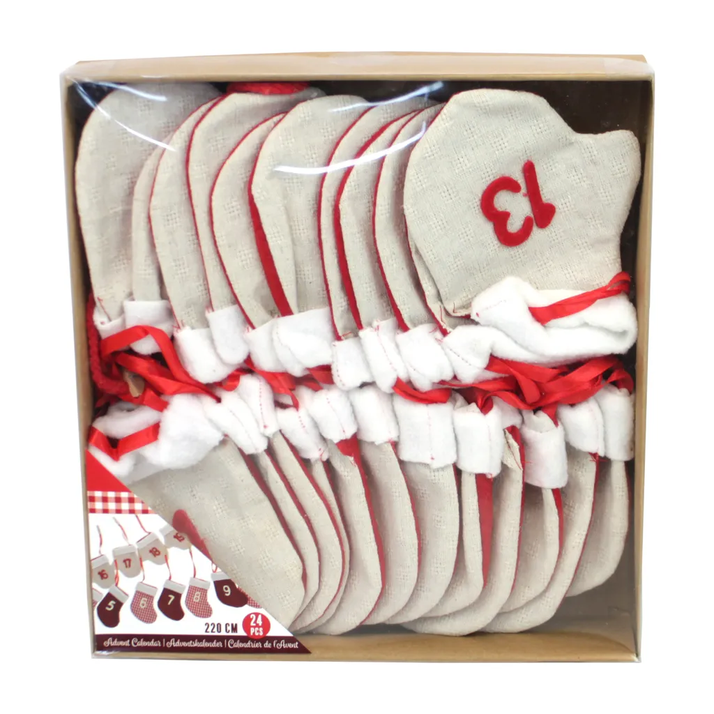 - DETAILS- Adventskalender ‚Fäustlinge ‚ – Zum Hinhängen als Wand- oder Türbehang – 24 Säcke, durchgehend nummeriert, in Rot/Beige- 24 Holzklammern, Naturfarben – Schnur zum Befestigen – Größe je Sack (Höhe x Breite): ca. 13x9cm (innen) – Gesamtlänge: ca. 220cm – Material: 100% Polyester, Holz – Gesamtgewicht: ca.0,25kg