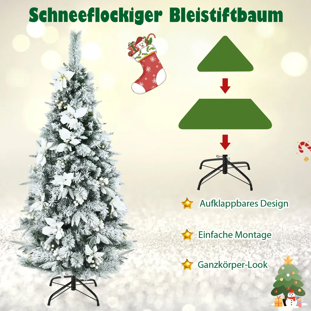 Unser 150cm hoher und verschneiter Weihnachtsbaum hat 339 dichte Zweige und sieht daher echt toll aus. Er ist mit weißen Beeren und Blumen geschmückt, und daher ideal für die Weihnachtssaison geeignet. Durch den robusten und klappbaren Metallständer steht er aufrecht und stabil. Um die Montage müssen Sie sich keine Gedanken machen, diese klingt dank des praktischen Klappdesigns sehr einfach. Dieser Baum wird der ganzen Familie gefallen!