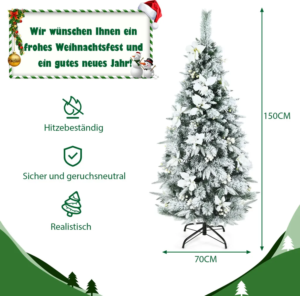 Der 150cm hohe Baum wird nicht nur üppig von Kunstschnee geschmückt, sondern auch von 228 weißen Beeren und eleganten weißen Weihnachtssternen, wodurch er sehr winterlich wirkt.