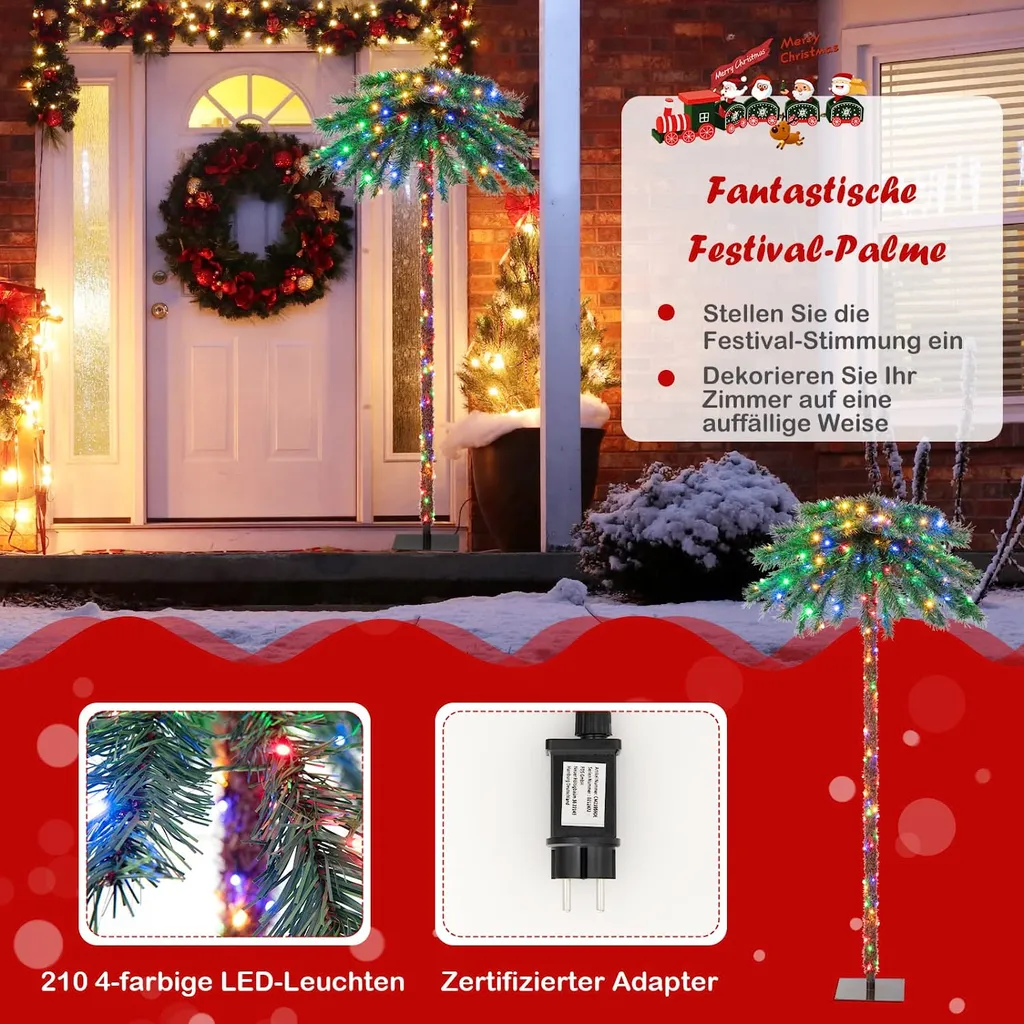 Holen Sie sich sommerliche Urlaubsstimmung nach Hause und genießen Sie ein einzigartiges Weihnachtsfest! Jedes Detail dieser künstlichen Palme ist sehr realistisch. Sie hat eine Baumkrone aus 64 PVC-Zweigspitzen, die feuerfest und lichtecht sind. Zusammen mit einem Metallständer verfügt der künstliche Weihnachtsbaum auch über einen dickeren Stamm für starken Halt. 210 LED-Leuchten sind gleichmäßig verteilt und geben rotes, grünes, gelbes und blaues Licht ab. Zweifellos wird die Weihnachtspalme Ihre Party perfekt schmücken und Ihre Gäste erfreuen. Darüber hinaus ist sie mit einem 3-teiligen Design bequem für die Montage und Lagerung. Zwei mitgelieferte Paar Handschuhe bieten qualifizierten Schutz. Platzieren Sie sie schließlich im Haus, im Büro, im Geschäft und auf dem Karneval! Sie wird ein besonderes Weihnachtsfest für Sie schaffen!
