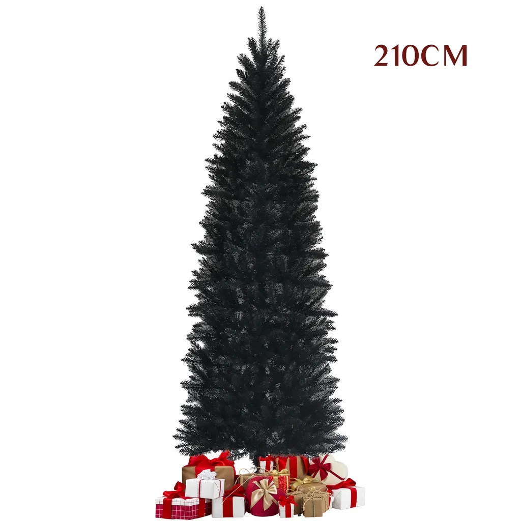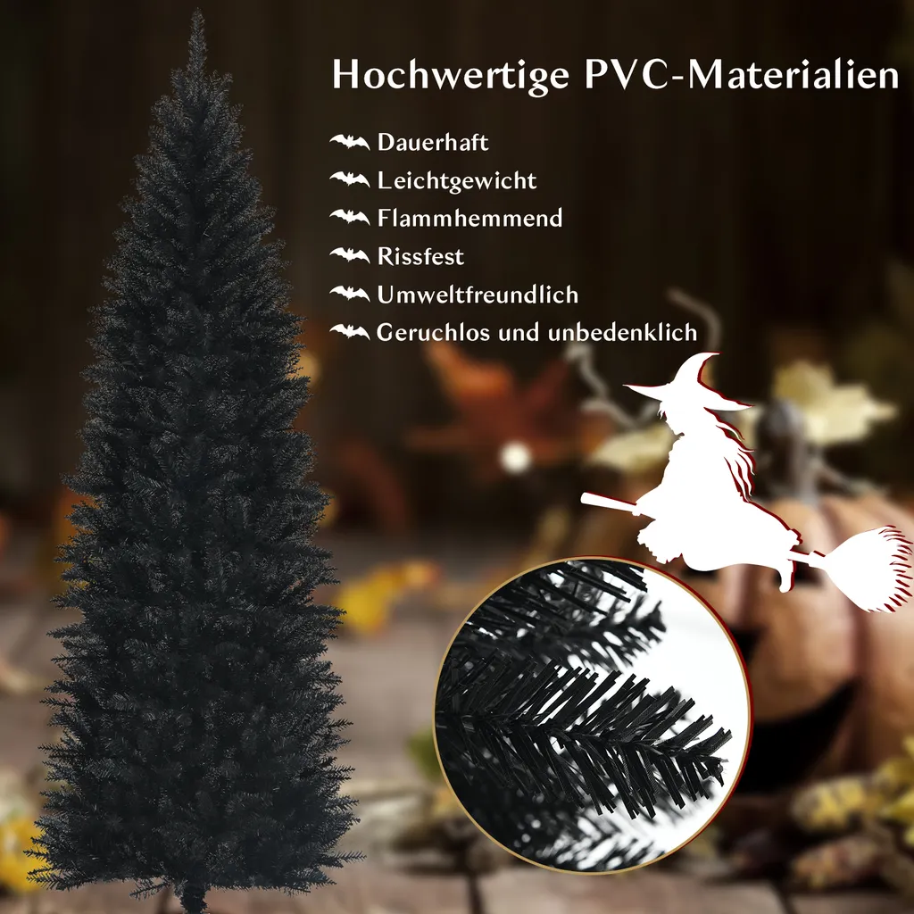 Unser 210 cm hoher schwarzer Kunstbaum kann nicht nur als Weihnachtsbaum verwendet werden, sondern auch an Halloween Blicke auf sich ziehen und eine gruselige Stimmung erschaffen. Er besteht aus brandneuem PVC und ist daher feuerfest, geruchlos und robust, sowie sicher für Kinder und Haustiere. Die 995 dichten Zweige und realistischen Nadeln sorgen für ein natürliches Aussehen. Außerdem hat unser Baum eine schlanke Bleistiftform, wodurch er platzsparend ist und sich ideal für Ecken eignet!