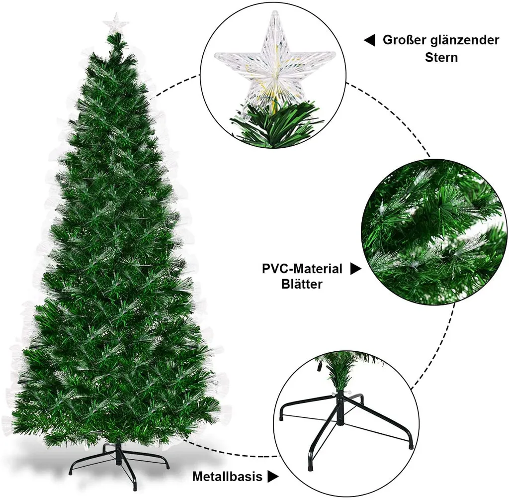 Dieser Weihnachtsbaum ist mit Lichtleitfaserröhren und elektrodenlosen Niederspannungs-LED-Leuchten in 7 verschiedenen Farben ausgestattet. Diese elektrodenlosen LED-Leuchten sind energieeffizient und langlebig. Alle Lichter aus optischer Faser werden nur mit offener Lichtquelle beleuchtet, auch ohne das LED-Licht. Durch das bereits beleuchtete Design wird es Ihnen erspart, extra Lichterketten kaufen und anbringen zu müssen. Sie müssen nur noch Ihre Lieblingsdekoration am Baum anbringen.