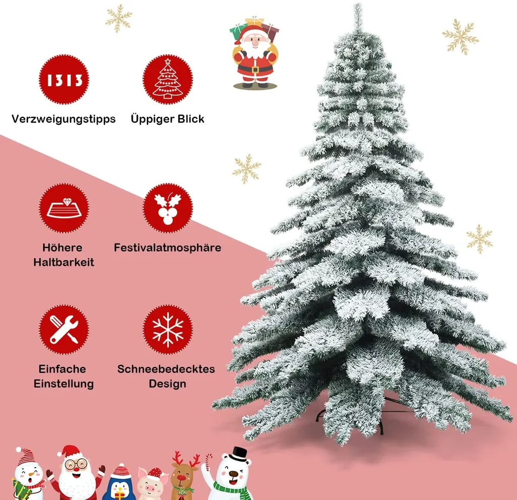 Bringen Sie mit dem schneebedecktem Weihnachtsbaum eine festliche Atmosphäre in Ihr Zuhause. Dieser Weihnachtsbaum eignet sich sowohl für den privaten als auch für den gewerblichen Bereich und bringt die Festtagsstimmung in jeden Raum. Er ist 225 cm hoch, mit 1313 Zweigen, hat eine volle Form und ist eine hübsche Dekoration, die Sie in Weihnachtsstimmung bringt. Sein Aussehen ist an das einer echten Kiefer angelehnt. Dank der klappbaren Zweige lässt er sich in Minuten superleicht auf- und abbauen. Mehr noch, durch das 100% neue, hochwertige PVC-Material ist der Weihnachtsbaum nicht nur geruchsfrei, sondern auch geeignet für einen langfristigen Gebrauch. Er wird auch mit einem stabilen Metallständer geliefert, so dass ergeradestehen kann, ohne umzufallen. Nehmen Sie diesen hübschen Tannenbaum mit nach Hause und Sie werden sich wie in einem verschneiten Wunderland fühlen.
