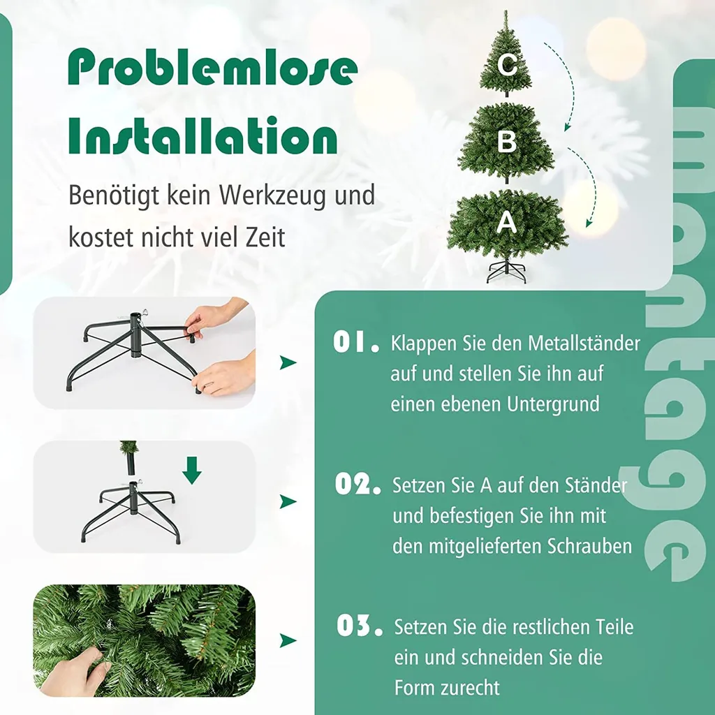 Dieser 3-teilige Weihnachtsbaum wird mit einer verständlichen und kurzen Anleitung geliefert, und ist leicht auf- und abzubauen sowie zu lagern. Die klappbaren Äste dieses Weihnachtsbaums lassen sich leicht ausklappen, wodurch er lebendiger aussieht und Ihnen viel Zeit spart.