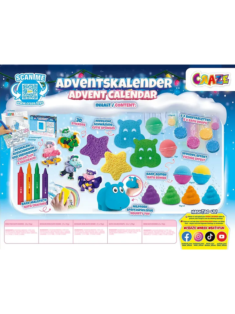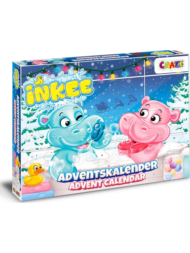 Der Badespaß kann kommen mit dem INKEE Hipo Adventskalender von CRAZE. Vierundzwanzig coole, lustige und bunte Überraschungen warten jeden Tag auf dich und machen die wöchentliche Badesession zu einem wahren Spielerlebnis. Badebomben, Schwämme und weitere coole Spielsachen warten darauf, endlich gemeinsam mit dir in die Wanne steigen zu können. Details:- Adventskalender INKEE Hipo Treasure von CRAZE- jeden Tag eine neue Überrschung- enthält Badebomben, Schwämme und mehr- ideal für kleine Wasserratten- im süßen Nilpferd-Design- Ausmalbilder auf der Rückseite Inhaltsstoffe:- Badebombe Mini Bomb (blau/gelb): SODIUM BICARBONATE, CITRIC ACID, SODIUM SULFATE, MANNITOL, PEG-12, PARFUM, [+/- CI 42090, CI 19140, CI 45100]- Badebombe Mini Bomb (blau/pink): SODIUM BICARBONATE, CITRIC ACID, SODIUM SULFATE, MANNITOL, PEG-12, PARFUM, [+/- CI 42090, CI 19140, CI 45100].Badebombe Mini Poo (grün): SODIUM BICARBONATE, CITRIC ACID, SODIUM SULFATE, MANNITOL, PEG-12, PARFUM, [+/- CI 42090, CI 19140, CI 17200, CI 45100]- Badebombe Mini Poo (orange): SODIUM BICARBONATE, CITRIC ACID, SODIUM SULFATE, MANNITOL, PEG-12, PARFUM, [+/- CI 42090, CI 19140, CI 17200, CI 45100].Badebombe Mini Poo (blau): SODIUM BICARBONATE, CITRIC ACID, SODIUM SULFATE, MANNITOL, PEG-12, PARFUM, [+/- CI 42090, CI 19140, CI 17200, CI 45100]- Badebombe Mini Poo (lila): SODIUM BICARBONATE, CITRIC ACID, SODIUM SULFATE, MANNITOL, PEG-12, PARFUM, [+/- CI 42090, CI 19140, CI 17200, CI 45100]- Badebombe Fruity Ball (grün): SODIUM BICARBONATE, CITRIC ACID, SODIUM SULFATE, MANNITOL, PEG-12, PARFUM, [+/- CI 45100, CI 42090, CI 19140]- Badebombe Fruity Ball (lila): SODIUM BICARBONATE, CITRIC ACID, SODIUM SULFATE, MANNITOL, PEG-12, PARFUM, [+/- CI 45100, CI 42090, CI 19140]- Badedrop (gelb/pink): SODIUM SULFATE, SODIUM BICARBONATE, SODIUM CHLORIDE, SUCCINIC ACID, PEG-150, PARFUM, [+/- CI 17200, CI 19140, CI 42090]- Badedrop (blau/pink): SODIUM SULFATE, SODIUM BICARBONATE, SODIUM CHLORIDE, SUCCINIC ACID, PEG-150, PARFUM, [+/- CI 17200, CI 19140, CI 42090]- Badedrop (blau/gelb): SODIUM SULFATE, SODIUM BICARBONATE, SODIUM CHLORIDE, SUCCINIC ACID, PEG-150, PARFUM, [+/- CI 17200, CI 19140, CI 42090]