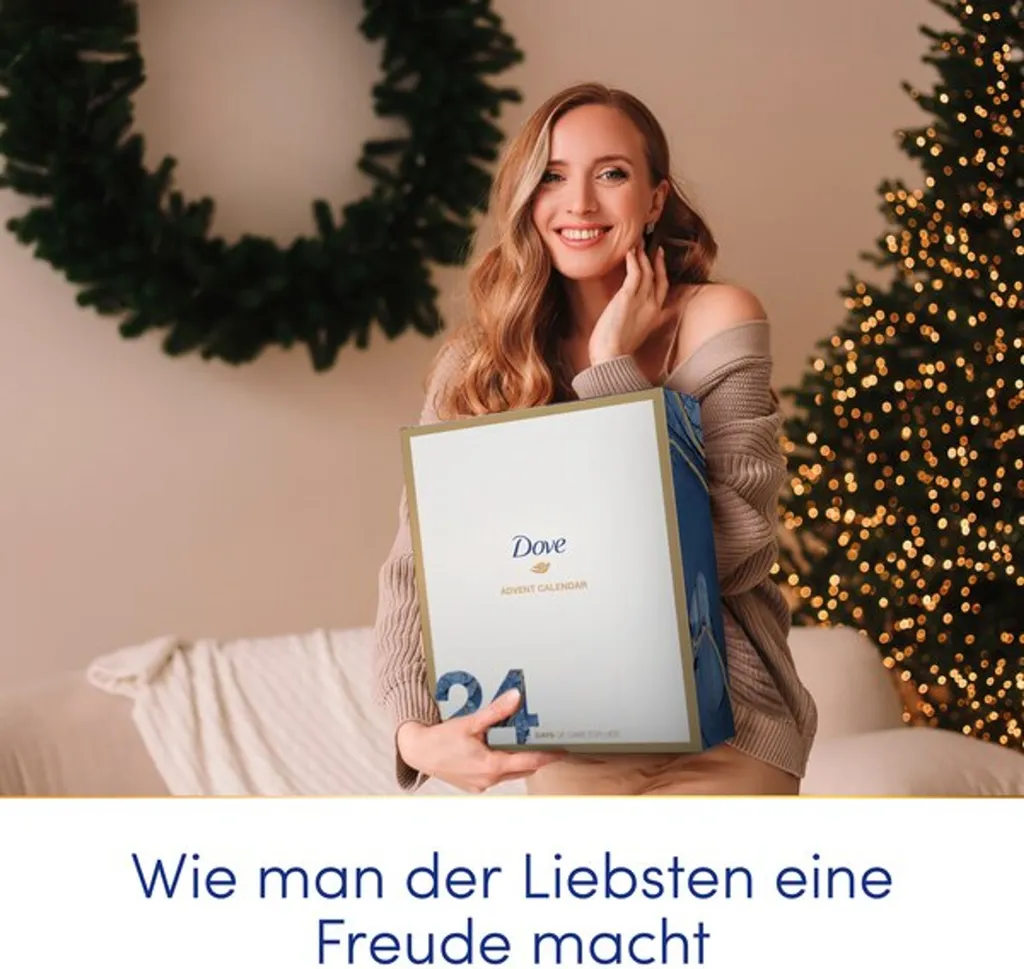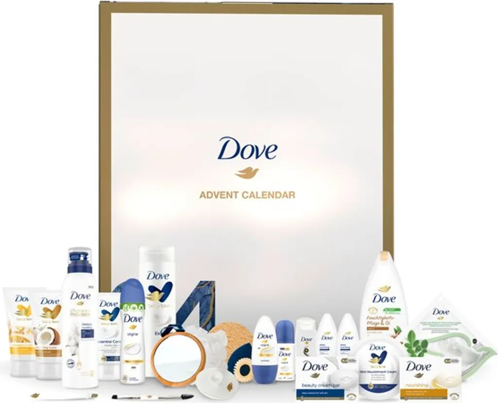 Adventskalender mit 24 Türchen von Dove – vielfältig, hochwertig und mit schönen Überraschungen für Eure Liebste. Weihnachten steht vor der Tür. Was gibt es da Besseres, als ein Adventskalender, um die Liebsten in Weihnachtsstimmung zu bringen? Dieser Dove Adventskalender für Frauen enthält 16 qualitative Dove Produkte und 8 Pflege-Accessoires, die Freude während der Adventszeit bringen. Von Dove gibt es im Pflegeset zwei Pflege-Duschgele der beliebten Variante Reichhaltige Pflege (je 55 ml), ein Duschgel Pflege & Öl (250 ml), sowie ein Duschschaum (200 ml). Für die Pflege der Haare gibt es einen Dove Conditioner (50 ml). Für die Reinigung und Pflege der Hände gibt es zwei Dove Seitenstücke der Variante beauty cream bar und cream oil (je 90 g), sowie drei pflegende Handcremes (je 75 ml) in verschiedenen Varianten. Zudem gibt es eine Dove Body Milk Reichhaltige Pflege (250 ml) und eine Dove Creme Reichhaltige Pflege (75 ml) für den Körper. Für den täglichen Schutz gibt es in praktischer Größe für unterwegs zwei Dove Deo-Spray Original (35 ml & 75ml), sowie ein Roll-On Original (50 ml). Für die Gesichtspflege erwartet Sie eine Dove Gesichtsmaske. Zudem enthält der Adventskalender acht praktische Pflege-Accessoires als Geschenke für Frauen: einen Pouf-Badeschwamm, eine Pinzette, einen Haarring, einen Gesichtsreiniger, einen Duschschwamm, eine Augenbrauenbürste, einen Hand-Bambusspiegel und einen Beauty-Blender.