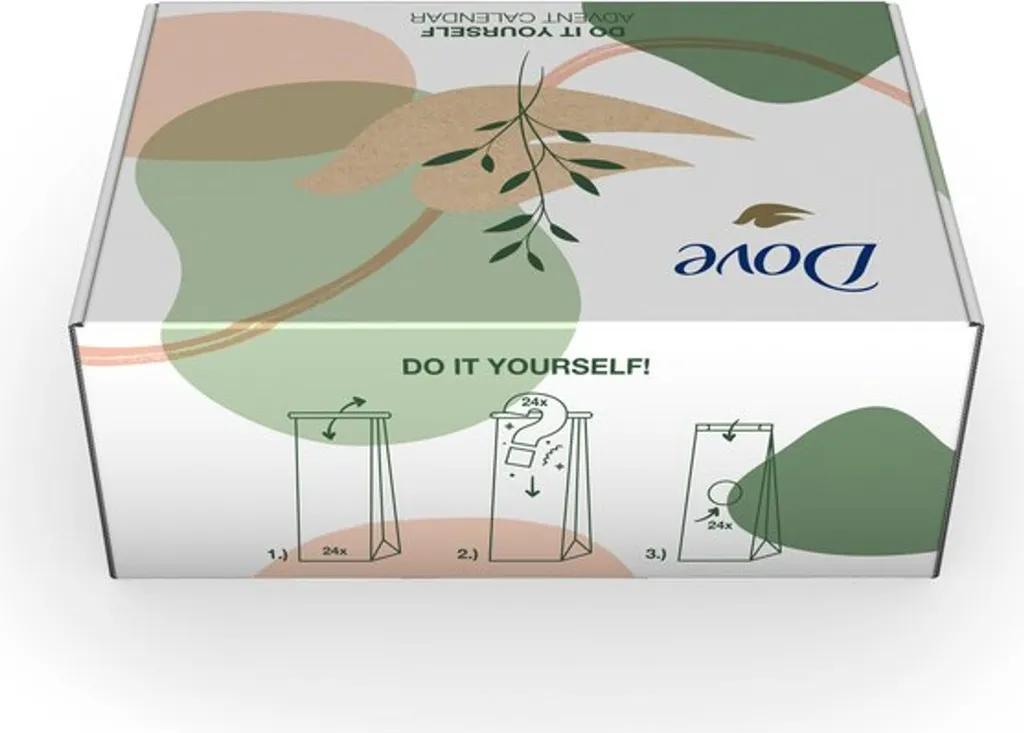 DIY-Adventskalender von Dove – vielfältig, zum Befüllen und mit schönen Überraschungen für Eure Liebste. Weihnachten steht vor der Tür. Was gibt es da Besseres, als ein DIY-Adventskalender, um die Liebsten in Weihnachtsstimmung zu bringen? Dieser Do-It-Yourself-Adventskalender für Frauen enthält 16 qualitative Produkte von Dove und 8 Pflege-Accessoires, die Freude während der Adventszeit bringen. Dank der 24 praktischen Papiertüten und der 24 Zahlen-Sticker kann der Adventskalender individuell befüllt werden. Von Dove gibt es im Pflegeset zwei Pflege-Duschgele der beliebten Variante Reichhaltige Pflege (je 55 ml), ein Duschgel Pflege & Öl (250 ml), sowie ein Duschschaum (200 ml). Für die Pflege der Haare gibt es einen Dove Conditioner (50 ml). Für die Reinigung und Pflege der Hände gibt es zwei Dove Seitenstücke der Variante beauty cream bar und cream oil (je 90 g), sowie drei pflegende Handcremes (je 75 ml) in verschiedenen Varianten. Zudem gibt es eine Dove Body Milk Reichhaltige Pflege (250 ml) und eine Dove Creme Reichhaltige Pflege (75 ml) für den Körper. Für den täglichen Schutz gibt es in praktischer Größe für unterwegs zwei Dove Deo-Spray Original (35 ml & 75ml), sowie ein Roll-On Deo Original (50 ml). Für die Gesichtspflege erwartet Sie eine Dove Gesichtsmaske. Zudem enthält der Adventskalender acht praktische Pflege-Accessoires: einen Pouf-Badeschwamm, eine Pinzette, einen Haarring, einen Gesichtsreiniger, einen Duschschwamm, eine Augenbrauenbürste, einen Hand-Bambusspiegel und einen Beauty-Blender. Der DIY-Adventskalender wird in vier einfachen Schritten zusammengestellt: 1. Verpackung öffnen. 2. Produkte & Geschenkartikel in die Papiertüten legen. 3. Papiertüten mit Hilfe der angebrachten Clips verschließen. 4. Papiertüten mit den Aufklebern beziffern.