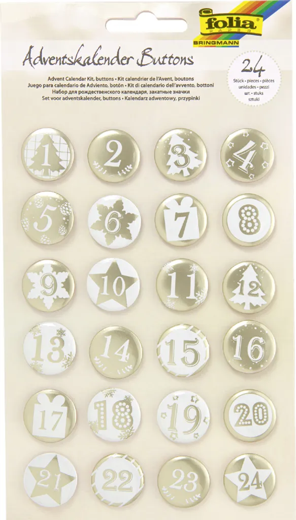 folia 1219 – Adventskalender Buttons, Perlmutt, 24 Stück, aus Metall, zum Gestalten individueller Adventskalender, weiß/gold