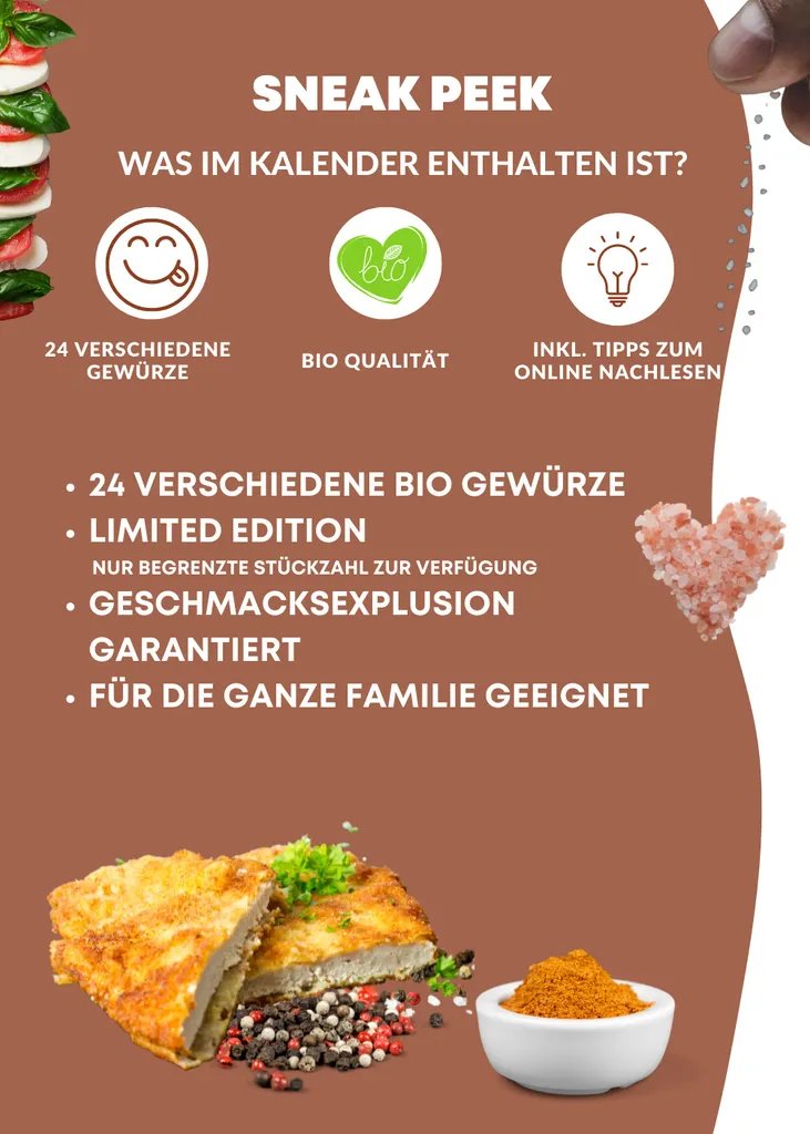 Seien Sie jeden Tag kreativ in der Küche und probieren Sie sich durch die edle Gewürzauswahl. Ob als Kalender zum selbst probieren, oder als Geschenk – diese Reise durch die Welt der Gewürze kommt immer gut an! Der schön gestaltete Karton kann sowohl aufgestellt, als auch an die Wand gehängt werden und is optisch ein Highlight in jeder Küche.