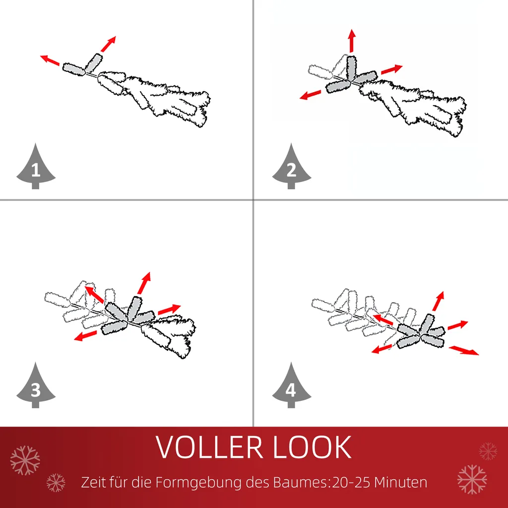 Gesamtmaße: Ø105 x 150H cm. Bitte beachten Sie: nur für den Innenbereich, nicht für den Außenbereich. Ornamente sind NICHT INBEGRIFFEN und werden nur für den Effekt verwendet. Um ein volles Erscheinungsbild zu erhalten, verteilen Sie bitte alle einzelnen Spitzen, um das bestmögliche Aussehen des Baumes zu erhalten. Wir empfehlen Ihnen, sich 20-25 Minuten Zeit zu nehmen, um den Baum zu formen.