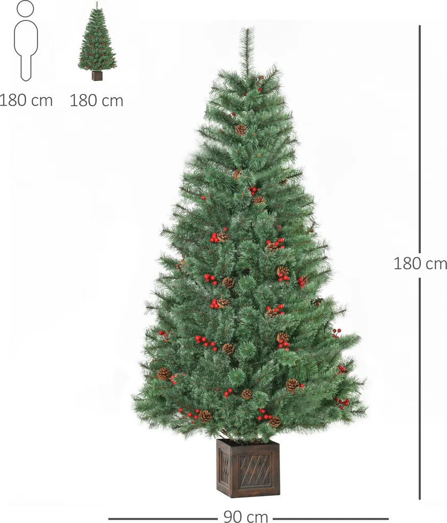 434 reichlich vorhandene Kunststoffzweigspitzen sorgen für eine vollmundige, dichte Tannenbaumform, die mit Tannenzapfen und roten Beeren zum Dekorieren versehen ist.