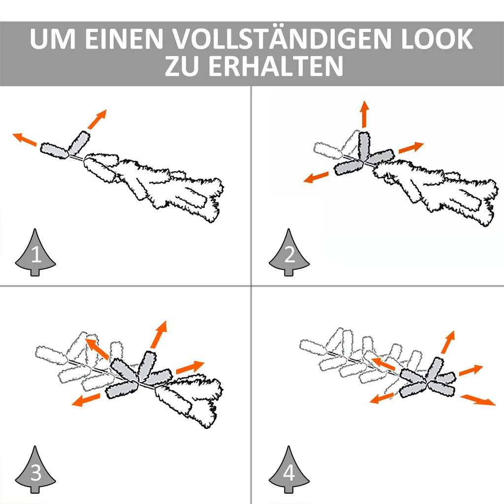 1. Um ein volles und buschiges Aussehen zu erhalten, verteilen Sie die losen Astspitzen gut über die gesamte Länge des Baums. 2. Im Lieferumfang ist kein Baumschmuck enthalten.