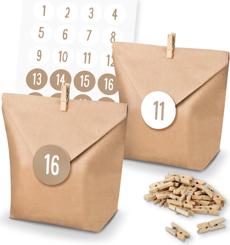 itenga Adventskalender SET Papiertüten + Deko Holz-Klammern – zum Basteln und Dekorieren