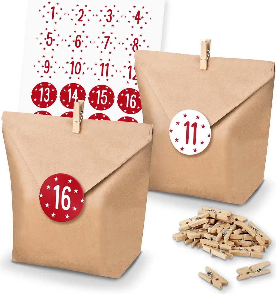 itenga Adventskalender SET Papiertüten + Deko Holz-Klammern – zum Basteln und Dekorieren