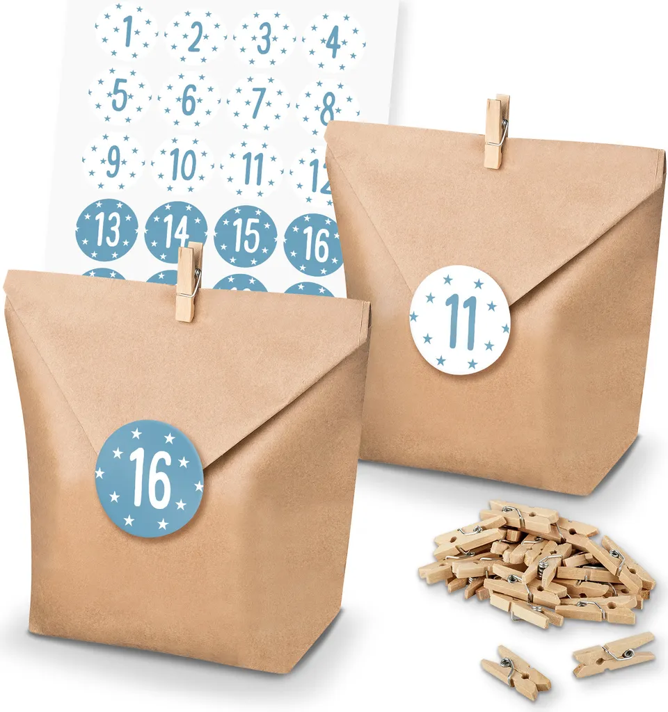 itenga Adventskalender SET Papiertüten + Deko Holz-Klammern – zum Basteln und Dekorieren