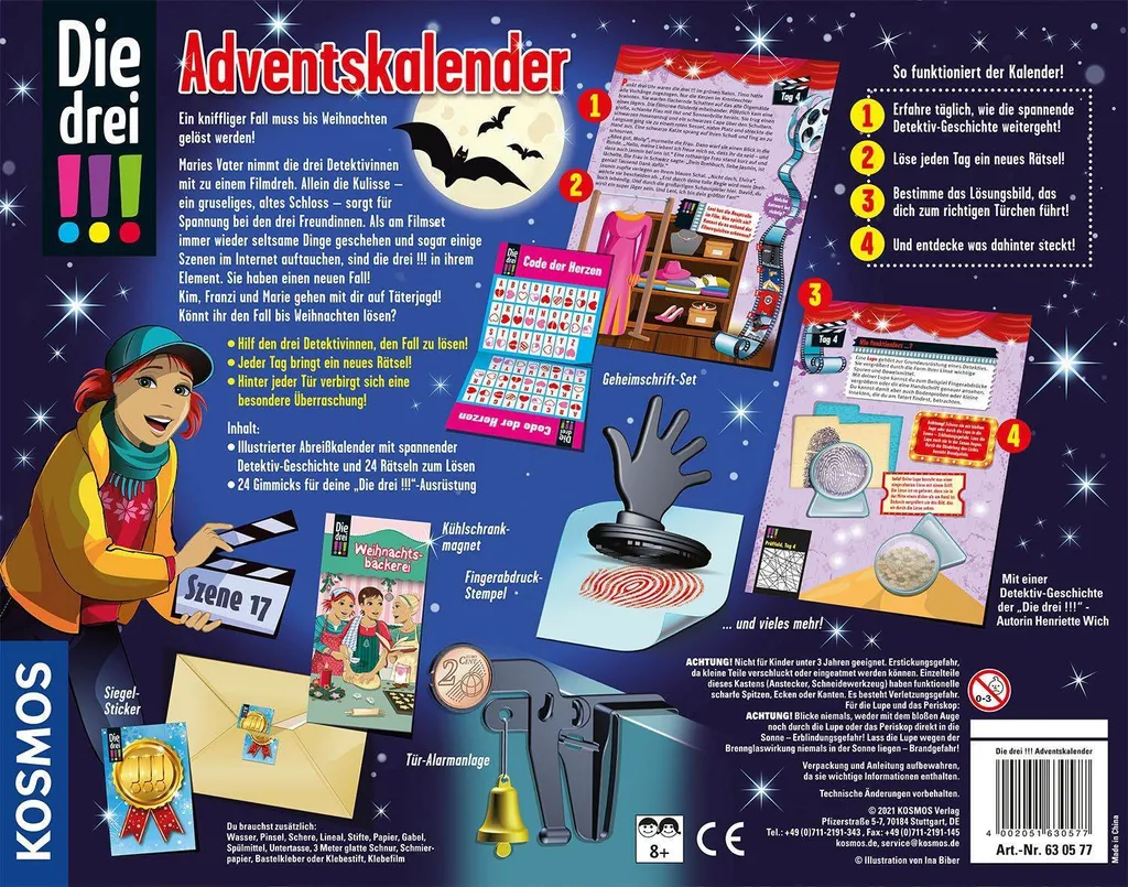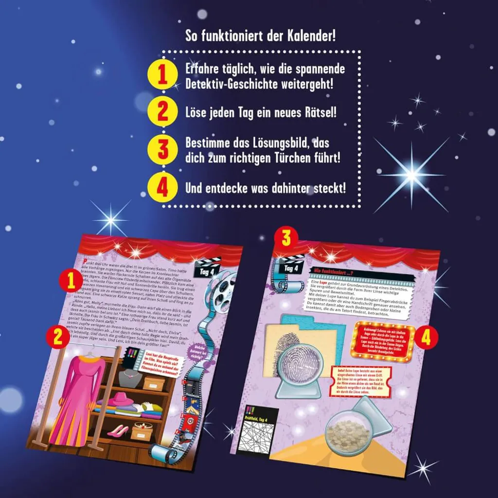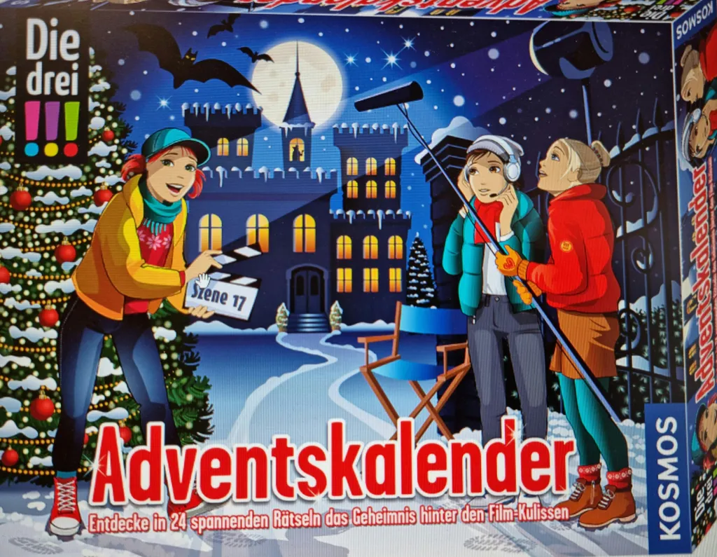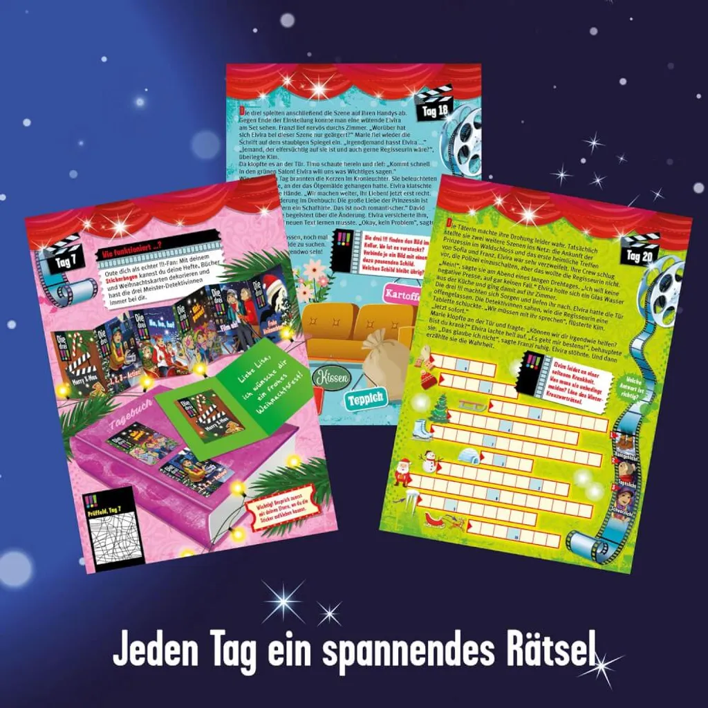 Aufregung am Filmset! Die drei !!! schauen hinter die Kulissen und geraten dabei in einen spannenden Fall – und ihnen bleiben nur 24 Tage, um ihn zu lösen. Zum Glück werden die Detektivinnen bei ihrer Spurensuche von Kindern ab 8 Jahren unterstützt! Wie das geht? Um das nächste Türchen im Adventskalender zu finden, lesen sie die fesselnde Detektivgeschichte und lösen täglich ein kniffliges Rätsel. Das verborgene Lösungsbild zeigt den Ermittlern, wo es am nächsten Tag weitergeht. Zur Belohnung wartet hinter jedem Türchen ein cooles Gimmick. So vergeht die Zeit bis Weihnachten im Flug!