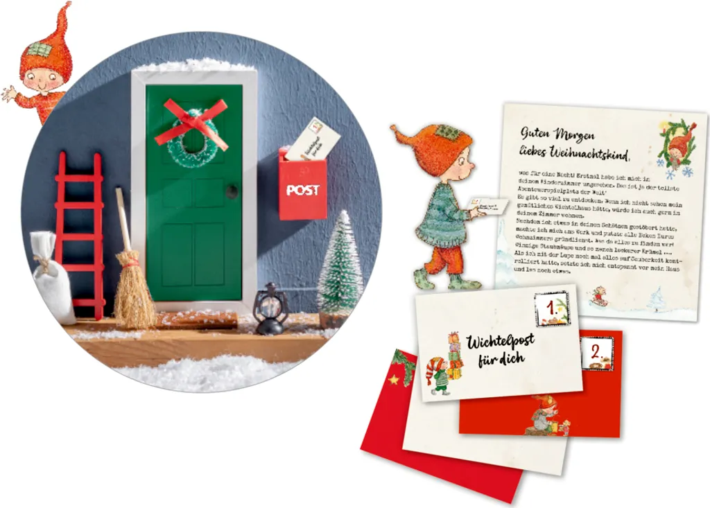 Das 8-teilige Wichteltürset wird mit den 24 Wichtelbriefen zum magischen Adventskalender. Hinter der kleinen Holztür zieht im Advent der Weihnachtswichtel ein. Nachts, wenn alle schlafen, soll er die Familie bei ihren Weihnachtsvorbereitungen unterstützen. Was er dabeí erlebt und welchen Schabernack er treibt, erzählt er seinem Weihnachtskind in kleinen Briefen, die täglich im Briefkasten vor seiner Tür stecken.