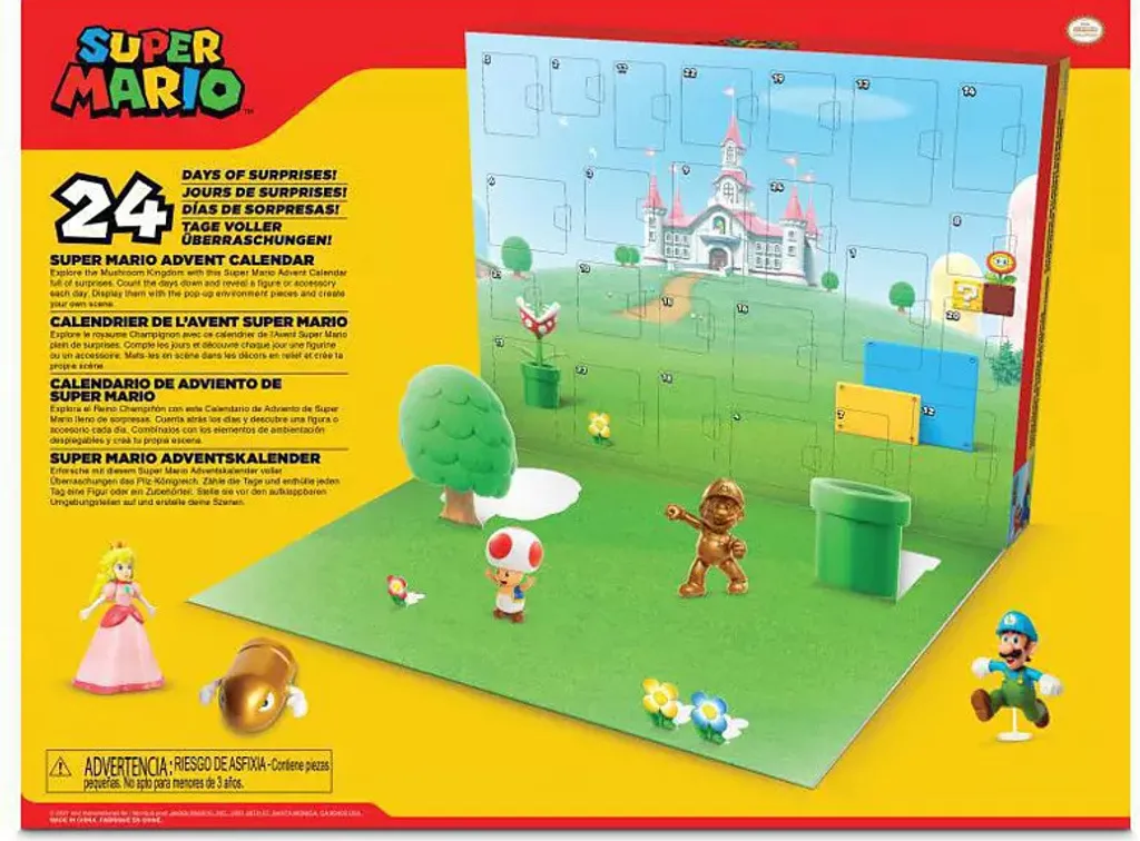 Der Adventskalender „Super Mario & Co.“ von Jazwares bietet den kleinen Fans der beliebten Klempner- Brüder jede Menge tolle Überraschungen! Damit man auch ohne Bildschirm mit den Lieblingscharakteren spielen kann, sind hier siebzehn Charaktere aus den „Super Mario“-Games sowie sieben tolle Accessoires enthalten. Inhalt: 17 Figuren 7 Zubehörteile Figurenmaße: ca. 6,5 cm Altersempfehlung: ab 3 Jahren