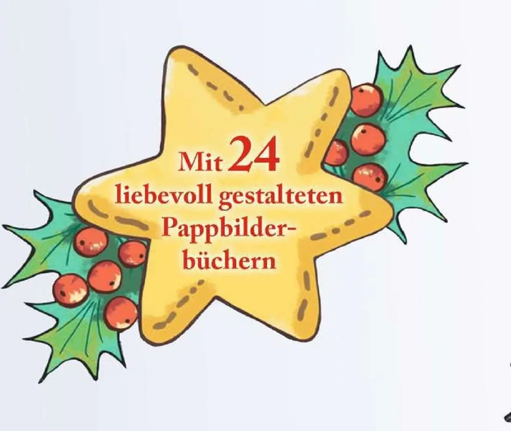 Mit tiptoi durch die Adventszeit!Der große tiptoi-Adventskalender sorgt für leuchtende Kinderaugen: Hinter den Klappen warten 24 liebevoll illustrierte und stabile Mini-Bücher, die die Wartezeit auf Weihnachten versüßen. Neben einigen Weihnachtstiteln gibt es Lieder- und Rätselbücher, Mitmachgedichte und Märchen sowie Sachbücher zu Tieren oder Fahrzeugen. Eine echte Alternative zum Schokoadventskalender, auch über die Adventszeit hinaus.Der große tiptoi-Adventskalender sorgt bereits vor dem ersten Türchen für Weihnachtsstimmung im Kinderzimmer. Der Kalender überrascht jeden Tag mit Lieblingsthemen, die abwechslungsreich verteilt sind: 24 kleine, stabile Pappbilderbücher zu folgenden Themen sind enthalten: Weihnachtliches: Zwei Weihnachtsgeschichten, Weihnachtslieder, Winterlieder, Adventsgedichte. Sachthemen: Tiere in Teich/Garten/Wald/Wiese und auf dem Bauernhof, Fahrzeuge und Berufe auf der Baustelle, Unterwegs. Zum Mitsingen und Mitmachen: Kinderlieder, Gutenachtlieder, zwei Gedichtbücher, zwei Fingerspielbücher. Erzählungen: Zwei Märchenbücher, eine Rittergeschichte. Zum Rätseln: zwei Rätselbücher mit interaktiven Spielen, die Wahrnehmung und Konzentration fördern. Die riesige Titel- und Innenillustration lädt zusätzlich zum Immer-wieder-Betrachten und Entdecken der liebevollen Adventsszenen ein. tiptoi-Stift nicht enthalten. Muss separat erworben werden.