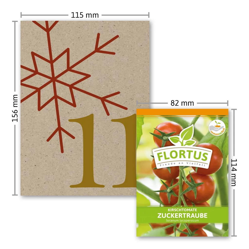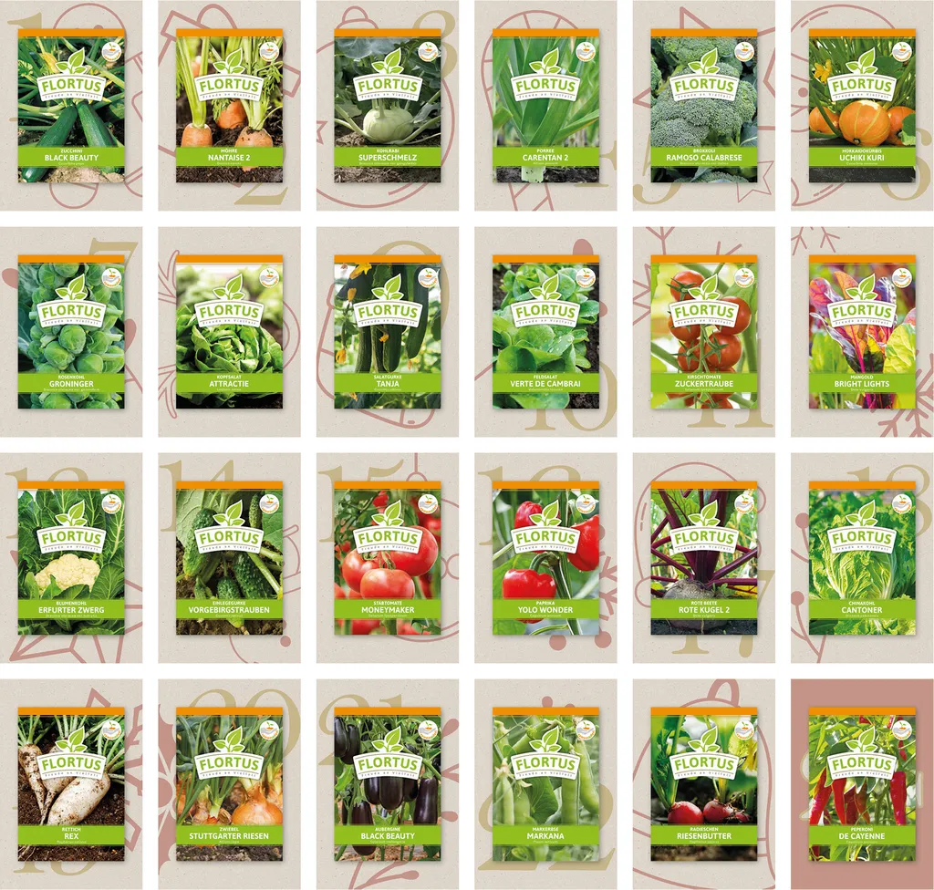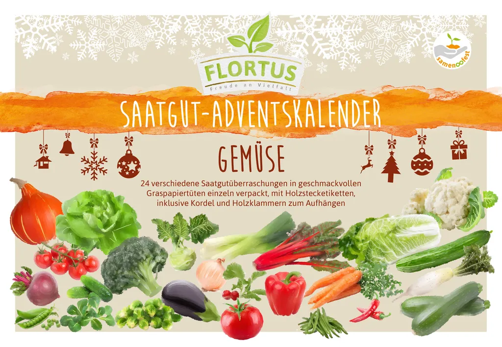 Weihnachten ist eine aufregende Zeit voller Vorfreude und Spannung. Ein Adventskalender verkürzt die Tage bis zum Weihnachtsfest. Mit unserem FLORTUS Saatgut-Adventskalender können Sie Gartenfreunden und sich selbst ein eine große Freude machen und die Zeit bis zum Heiligabend verkürzen. Denn unser FLORTUS Saatgut-Adventskalender steckt voller Überraschungen. 24 Saatgut-Tütchen mit Gemüsesamen und noch vieles mehr erwarten Sie hinter den Türchen. Jeden Tag dürfen Sie oder der Beschenkte sich auf eine kleine Vorweihnachts-Überraschung freuen. Der Adventskalender lässt sich einfach zusammenbauen, denn alles was benötigt wird, bekommen Sie mit dem Weihnachtskalender.