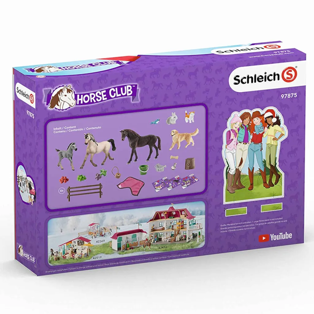 Der Horse-Club-Adventskalender erzählt die Abenteuer von Kätzchen, Hund und Kaninchen auf der Pferdeweide. Jeden Tag erleben sie dort etwas Spannendes: Das Kaninchen entdeckt frische Äpfel, die aus dem Futtereimer des Araber-Fohlens gekullert sind. Das Katzenbaby klettert über die Raufe auf den Rücken des Vollblut-Hengstes, und der Hund kaut genüsslich auf seinem Knochen, während die Araber-Stute das Gleiche mit ihrem Knabberstein tut. Die Schleich® Figuren sind alle detailgetreu modelliert und stehen für pädagogisch wertvolles Spielen.