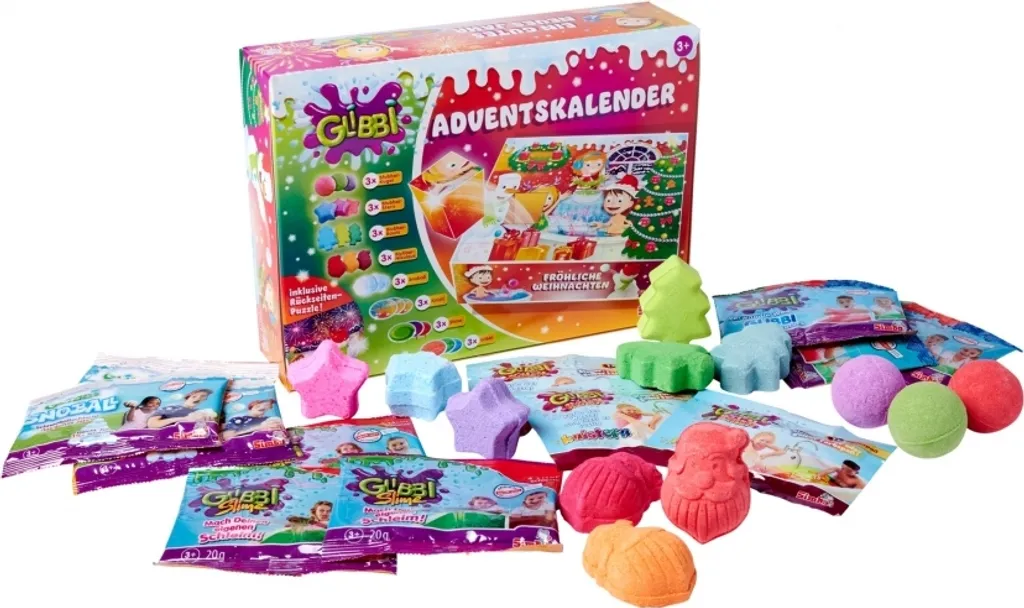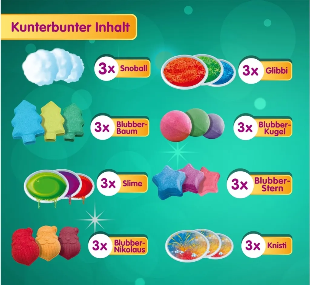 Weihnachtlicher Badespaß von Simba. mit diesem Adventskalender erhältst du eine große Auswahl an verschiedenem Badezusatz. So abwechslungsreich war es in der Badewanne noch nie. Bunte Badebomben in weihnachtlichen Formen under andere Specials warten schon darauf, endlich erprobt zu werden. Details:- Glibbi Adventskalender von Simba- 24 Überraschungen- cooles ZubehörInhalt:- 3x Blubberkugel- 3x Blubberstern- 3x Blubberbaum- 3x Snoball- 3x Knisti- 3x Slime- 3x Glibbi