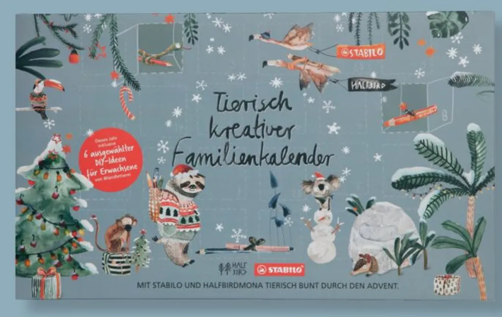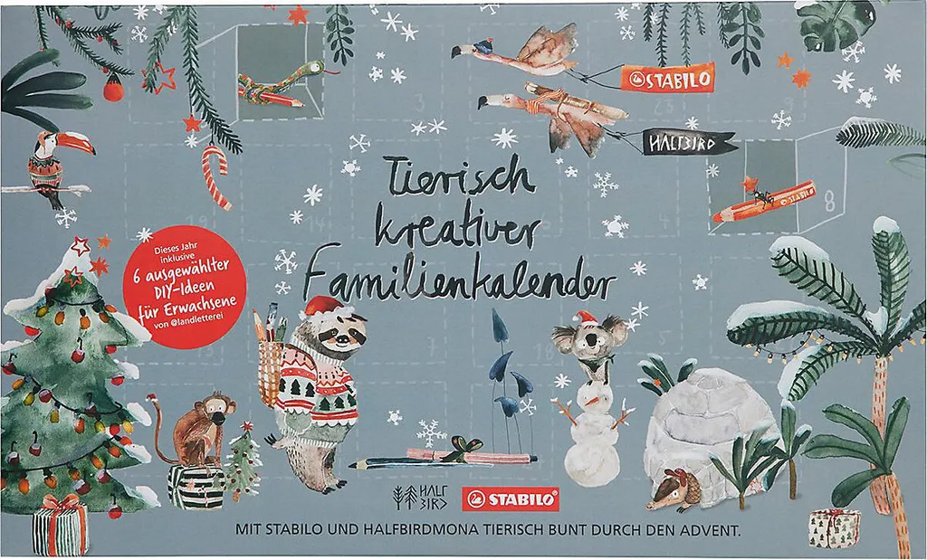 | limitierter Adventskalender für die ganze Familie^mit 57 STABILO Produkten sowie hochwertigen Zusatzmaterialien^24 kreative Mal- und Bastelideen für Kinder ab 3 Jahren^6 zusätzliche Projekte für Erwachsene oder ältere Kinder (von landletterei)^20 Vorlagen im Kalender und weitere Onlinevorlagen^inkl. Begleitheft mit detaillierten Anleitungen^in Kooperation mit der Illustratorin halfbirdmona |