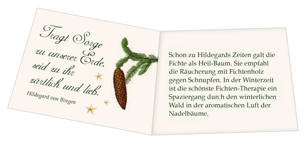 Zauberhafter Adventskalender mit Illustrationen von Heilkräutern- und Pflanzen nach Hildegard von Bingen in nostalgisch anmutender Pflanzentafel-Optik. Hinter den 24 Türchen verstecket sich Wissenswertes rund um Hildegard von Bingen und ihre Empfehlungen zu den abgebildeten Kräutern und Pflanzen.