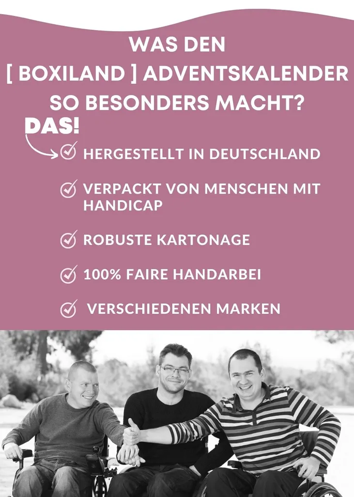 Um den sozialen Aspekt unserer Marke zu wahren, werden alle Kalender HÄNDISCH & LIEBEVOLL von Menschen mit Behinderung in sozialen Einrichtungen befüllt und verpackt.